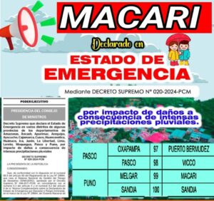 #MACARI GOBIERNO DECLARA A DISTRITO MACARI EN ESTADO DE EMERGENCIA POR INTENSAS LLUVIAS